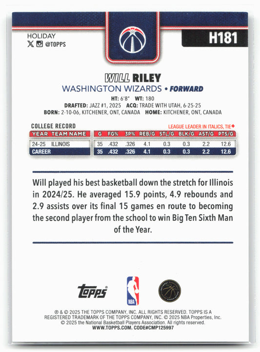 This is a nice example of a 2025-26 Topps Holiday #H181 Will Riley Glitter Holiday Other important information about this card:25126RCIn 2025 Will Riley played for the Washington Wizards.Please check...