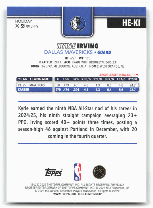 This is a nice example of a 2025-26 Topps Holiday #HE-KI Kyrie Irving Hidden Elf Other important information about this card:25128In 2025 Kyrie Irving played for the Dallas Mavericks.Please check...