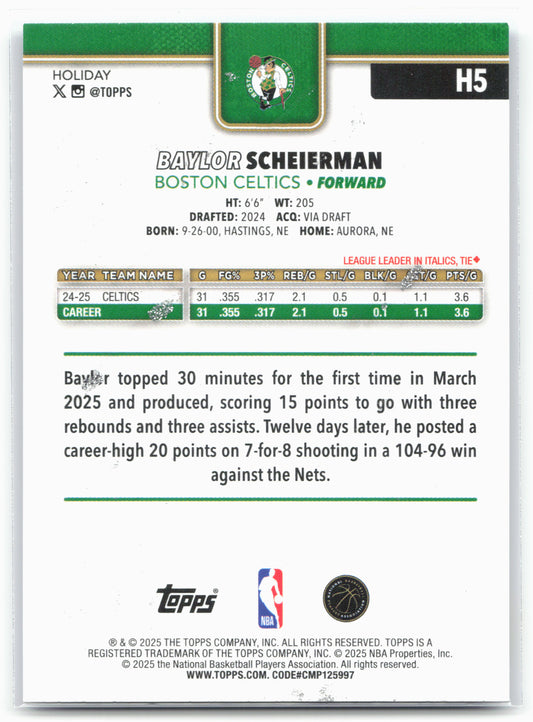 This is a nice example of a 2025-26 Topps Holiday #H5 Baylor Scheierman Light Blue and White Glitter Holiday Other important information about this card:25129In 2025 Baylor Scheierman played for...