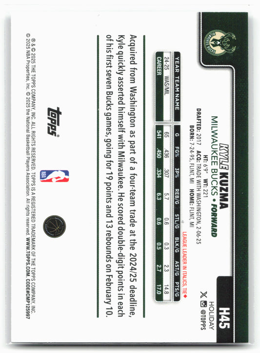 This is a nice example of a 2025-26 Topps Holiday #H45 Kyle Kuzma Glitter Holiday Other important information about this card:25132In 2025 Kyle Kuzma played for the Milwaukee Bucks.Please check...
