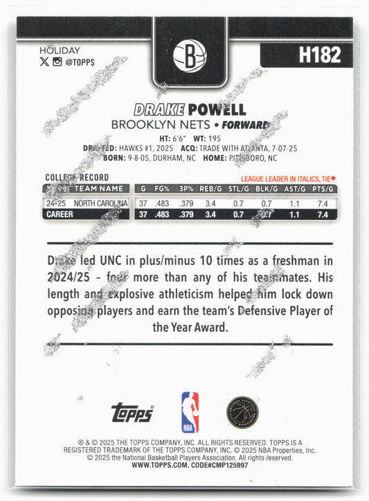 This is a nice example of a 2025-26 Topps Holiday #H182 Drake Powell Glitter Holiday Other important information about this card:25133RCIn 2025 Drake Powell played for the Brooklyn Nets.Please check...