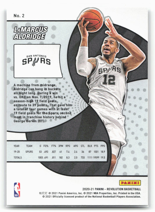 This is a nice example of a 2020-21 Panini Revolution #2 LaMarcus Aldridge Other important information about this card:In 2020 LaMarcus Aldridge played for the San Antonio Spurs.Please check out...