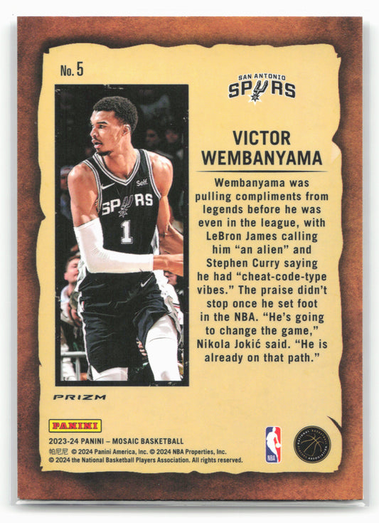 This is a nice example of a 2023-24 Panini Mosaic #5 Victor Wembanyama Notoriety Mosaic Other important information about this card:In 2023 Victor Wembanyama played for the San Antonio Spurs.Please...