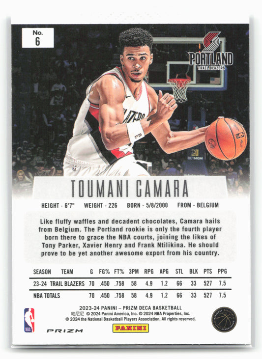 This is a nice example of a 2023-24 Panini Prizm Deca #6 Toumani Camara Prizms Silver Other important information about this card:In 2023 Toumani Camara played for the Portland Trail...
