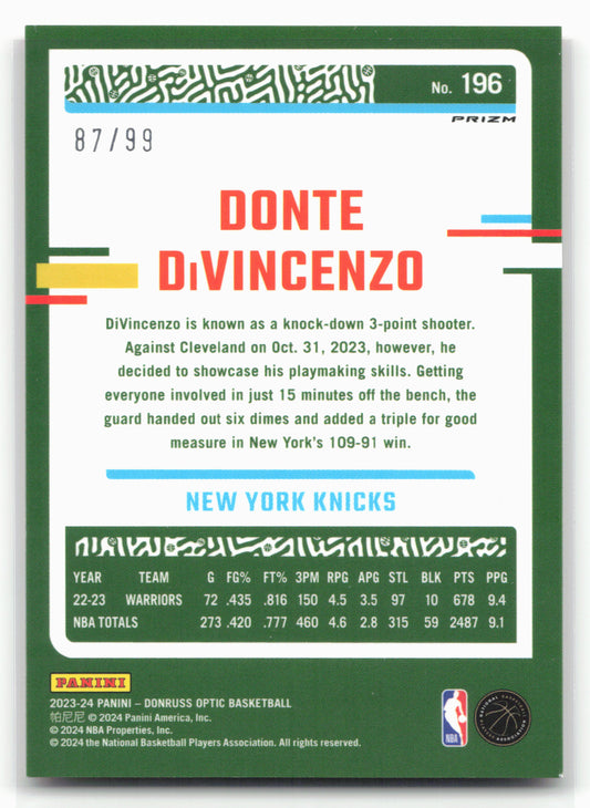 This is a nice example of a 2023-24 Donruss Optic #196 Donte DiVincenzo Red Other important information about this card:SNIn 2023 Donte DiVincenzo played for the New York Knicks.Please check...