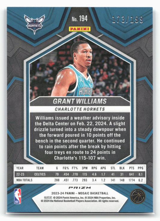 This is a nice example of a 2023-24 Panini Mosaic #194 Grant Williams Blue Other important information about this card:SNIn 2023 Grant Williams played for the Charlotte Hornets.Please check out...