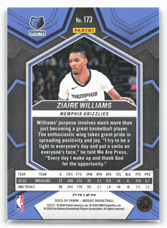 This is a nice example of a 2023-24 Panini Mosaic #173 Ziaire Williams Mosaic Other important information about this card:27598In 2023 Ziaire Williams played for the Memphis Grizzlies.Please check out...