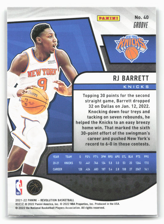 This is a nice example of a 2021-22 Panini Revolution #40 RJ Barrett Groove Other important information about this card:In 2021 RJ Barrett played for the New York Knicks.Please check...