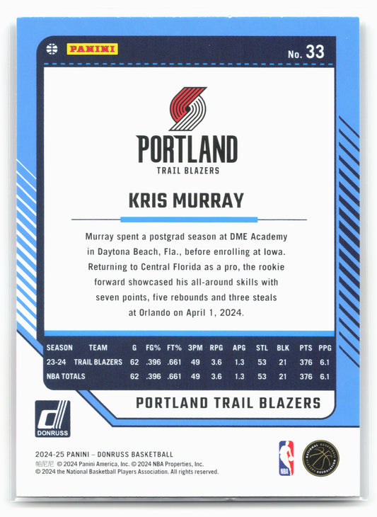 This is a nice example of a 2024-25 Donruss #33 Kris Murray Other important information about this card:In 2024 Kris Murray played for the Portland Trail Blazers.Please check out our...