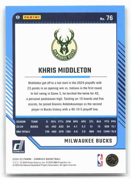 This is a nice example of a 2024-25 Donruss #76 Khris Middleton Other important information about this card:In 2024 Khris Middleton played for the Milwaukee Bucks.Please check out our other...