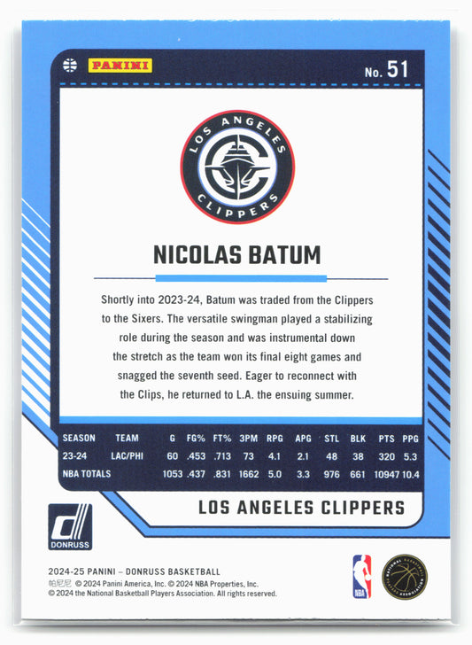 This is a nice example of a 2024-25 Donruss #51 Nicolas Batum Other important information about this card:In 2024 Nicolas Batum played for the Los Angeles Clippers.Please check out our...