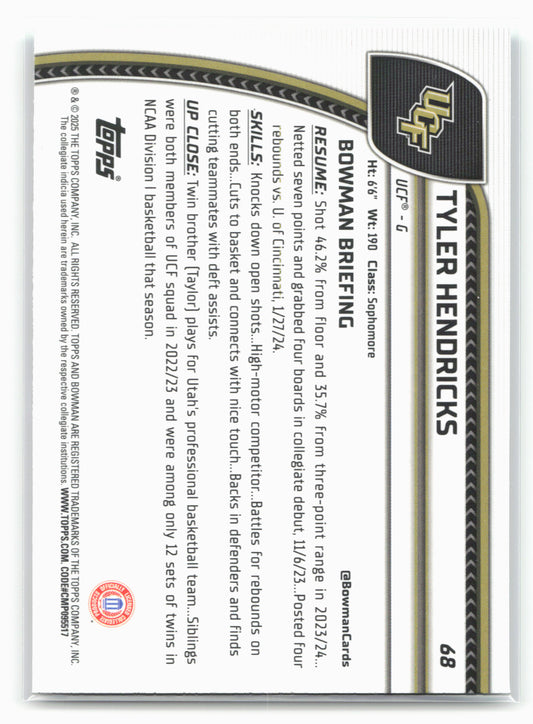 This is a nice example of a 2024-25 Bowman University Chrome #68 Tyler Hendricks Aqua Wave Refractor Other important information about this card:SNIn 2024 Tyler Hendricks played for the Central...