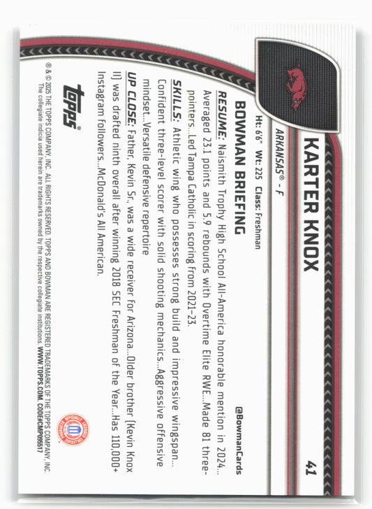 This is a nice example of a 2024-25 Bowman University Chrome #41 Karter Knox Gold Refractor Other important information about this card:SNIn 2024 Karter Knox played for the Arkansas Razorbacks.Please...