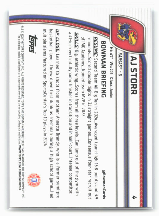 This is a nice example of a 2024-25 Bowman University Chrome #4 AJ Storr Sky Blue Refractor Other important information about this card:17934In 2024 AJ Storr played for the Kansas...