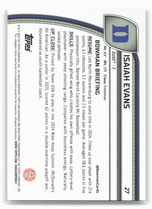 This is a nice example of a 2024-25 Bowman University Chrome #27 Isaiah Evans Other important information about this card:17941In 2024 Isaiah Evans played for the Duke Blue Devils.Please check...