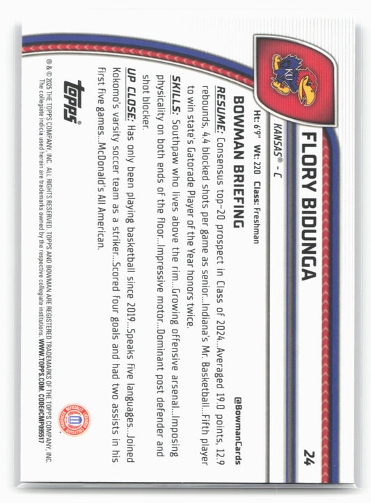 This is a nice example of a 2024-25 Bowman University Chrome #24 Flory Bidunga Other important information about this card:17944In 2024 Flory Bidunga played for the Kansas Jayhawks.Please check out...