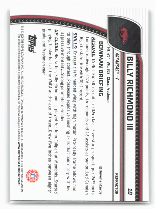 This is a nice example of a 2024-25 Bowman University Chrome #10 Billy Richmond III Refractor Other important information about this card:17947In 2024 Billy Richmond III played for the Arkansas...