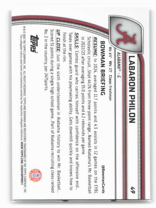 This is a nice example of a 2024-25 Bowman University Chrome #49 Labaron Philon X-Fractor Other important information about this card:17951In 2024 Labaron Philon played for the Alabama Crimson Tide.Please...
