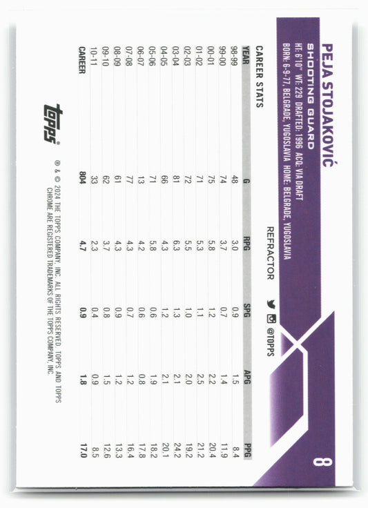 This is a nice example of a 2023-24 Topps Chrome #8 Peja Stojakovic Refractors Other important information about this card:In 2023 Peja Stojakovic played for the Sacramento Kings.Please check out...