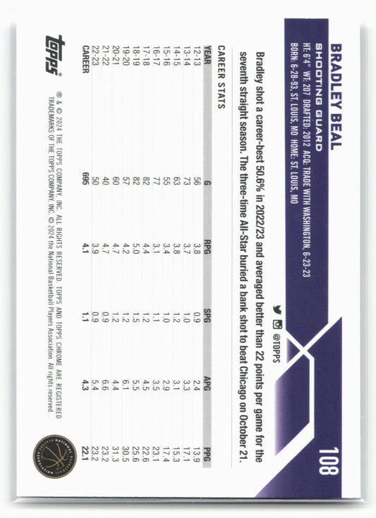 This is a nice example of a 2023-24 Topps Chrome #108 Bradley Beal Prism Refractors Other important information about this card:In 2023 Bradley Beal played for the Phoenix Suns.Please check...