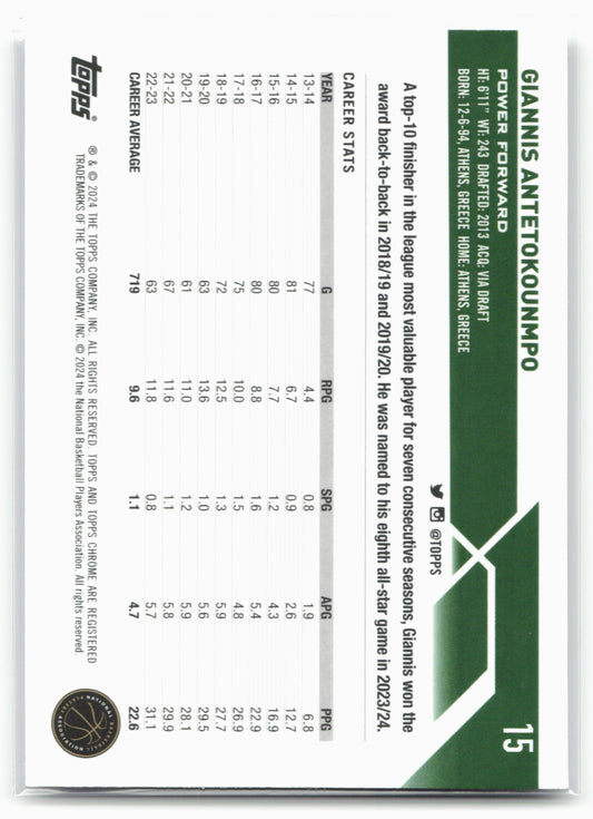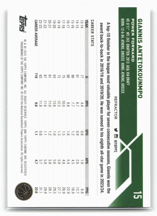 This is a nice example of a 2023-24 Topps Chrome #15 Giannis Antetokounmpo Refractors Other important information about this card:In 2023 Giannis Antetokounmpo played for the Milwaukee Bucks.Please check out...