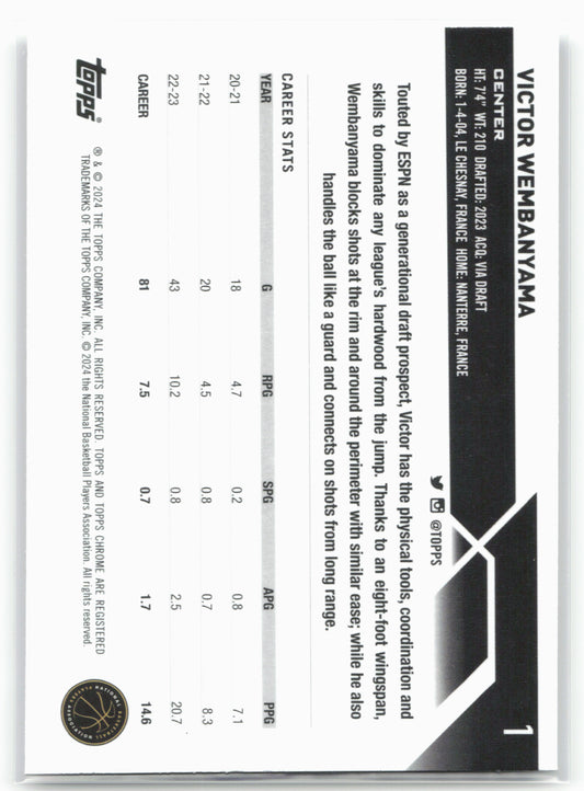 This is a nice example of a 2023-24 Topps Chrome #1 Victor Wembanyama Other important information about this card:17817RCIn 2023 Victor Wembanyama played for the San Antonio Spurs.Please check out...