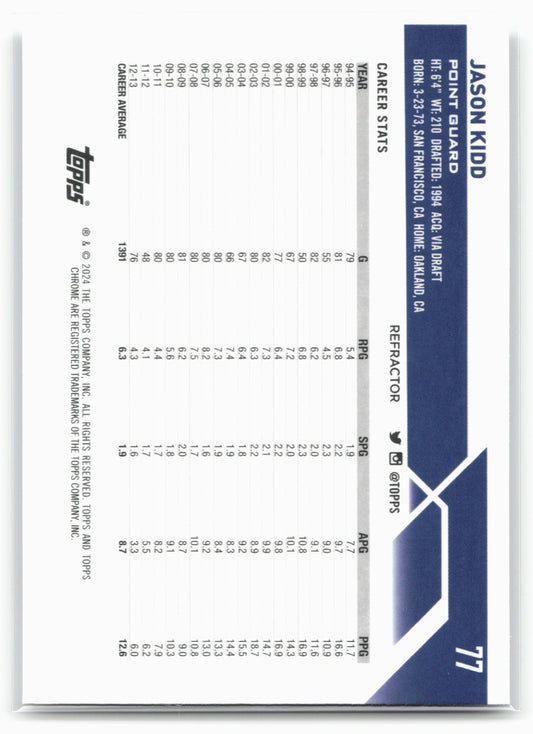 This is a nice example of a 2023-24 Topps Chrome #77 Jason Kidd Refractors Other important information about this card:In 2023 Jason Kidd played for the Dallas Mavericks.Please check out...