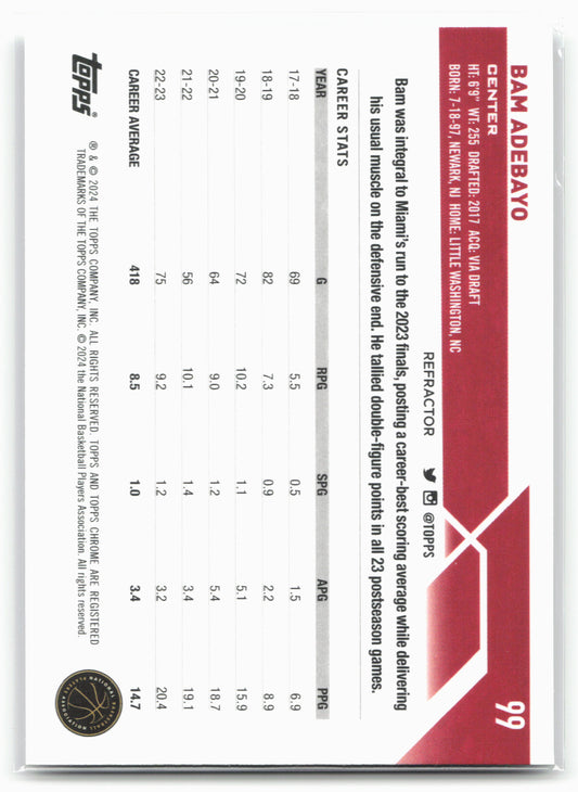 This is a nice example of a 2023-24 Topps Chrome #99 Bam Adebayo Refractors Other important information about this card:In 2023 Bam Adebayo played for the Miami Heat.Please check out...