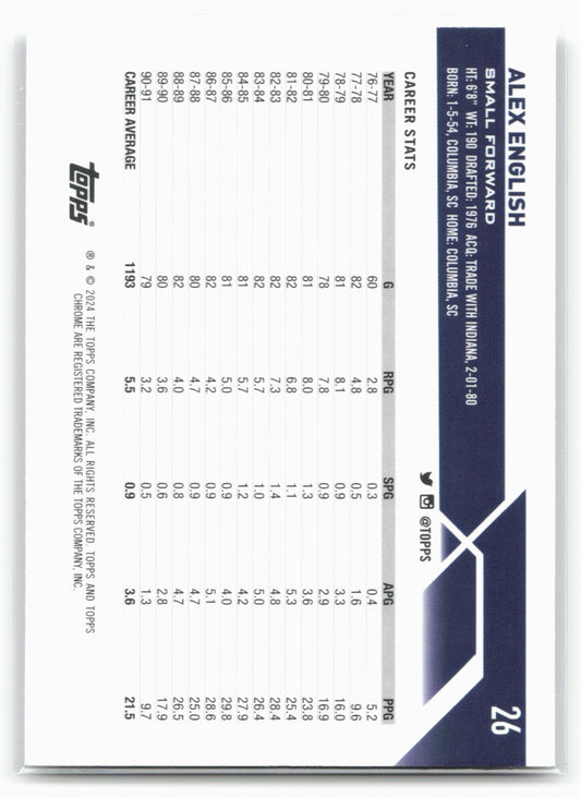 This is a nice example of a 2023-24 Topps Chrome #26 Alex English Negative Refractors Other important information about this card:In 2023 Alex English played for the Denver Nuggets.Please check...