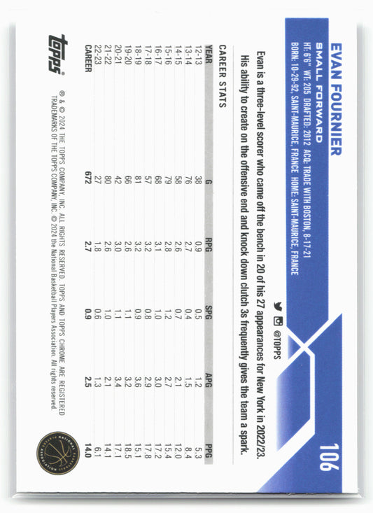 This is a nice example of a 2023-24 Topps Chrome #106 Evan Fournier Speckle Refractors Other important information about this card:SNIn 2023 Evan Fournier played for the Detroit Pistons.Please check...