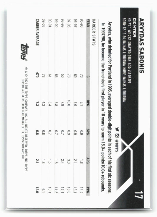 This is a nice example of a 2023-24 Topps Chrome #17 Arvydas Sabonis Aqua Refractors Other important information about this card:SNIn 2023 Arvydas Sabonis played for the Portland Trail Blazers.Please...