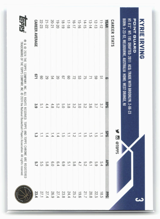 This is a nice example of a 2023-24 Topps Chrome #3 Kyrie Irving Blue Refractors Other important information about this card:SNIn 2023 Kyrie Irving played for the Dallas Mavericks.Please check...