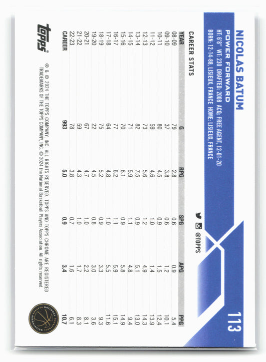 This is a nice example of a 2023-24 Topps Chrome #113 Nicolas Batum Purple Refractors Other important information about this card:SNIn 2023 Nicolas Batum played for the Philadelphia 76ers.Please check...