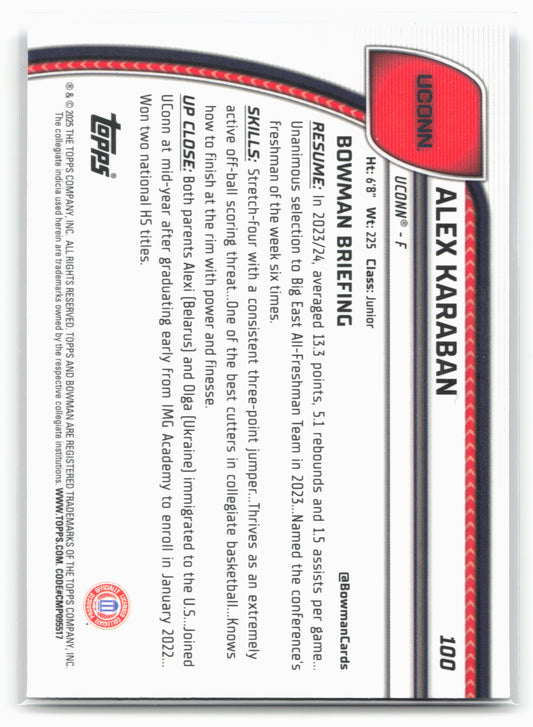 This is a nice example of a 2024-25 Bowman University Chrome #100 Alex Karaban Purple Lava Refractor Other important information about this card:In 2024 Alex Karaban played for the Connecticut...