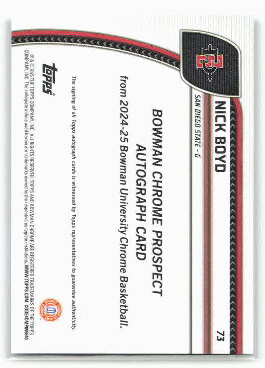 This is a nice example of a 2024-25 Bowman University Chrome #73 Nicholas Boyd Prospects Autographs Green Shimmer Refractor Other important information about this card:AUIn 2024 Nicholas Boyd played for...