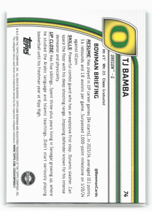 This is a nice example of a 2024-25 Bowman University Chrome #74 TJ Bamba Green Shimmer Refractor Other important information about this card:In 2024 TJ Bamba played for the Oregon...
