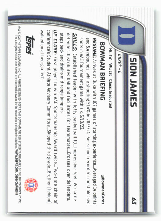 This is a nice example of a 2024-25 Bowman University Chrome #63 Sion James Green Shimmer Refractor Other important information about this card:In 2024 Sion James played for the Duke...