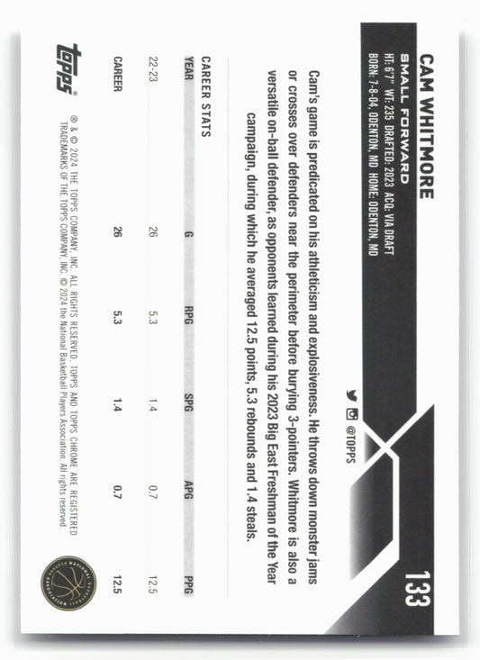 This is a nice example of a 2023-24 Topps Chrome #133 Cam Whitmore Other important information about this card:17787RCIn 2023 Cam Whitmore played for the Houston Rockets.Please check out our...