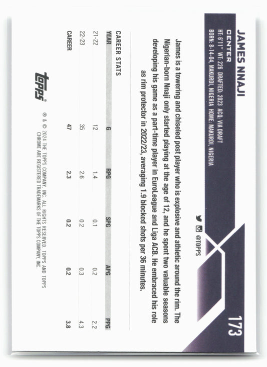This is a nice example of a 2023-24 Topps Chrome #173 James Nnaji Other important information about this card:17789RCIn 2023 James Nnaji played for the Charlotte Hornets.Please check out our...