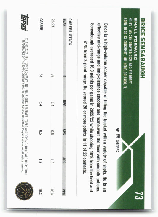 This is a nice example of a 2023-24 Topps Chrome #73 Brice Sensabaugh Other important information about this card:17790RCIn 2023 Brice Sensabaugh played for the Utah Jazz.Please check out our...