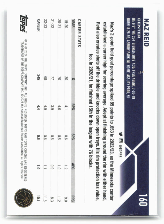 This is a nice example of a 2023-24 Topps Chrome #160 Naz Reid Other important information about this card:17791In 2023 Naz Reid played for the Minnesota Timberwolves.Please check out our...