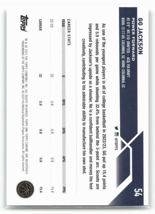 This is a nice example of a 2023-24 Topps Chrome #54 GG Jackson Other important information about this card:17793RCIn 2023 GG Jackson played for the Memphis Grizzlies.Please check out our...