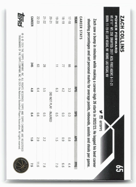 This is a nice example of a 2023-24 Topps Chrome #65 Zach Collins Other important information about this card:17794In 2023 Zach Collins played for the San Antonio Spurs.Please check out...