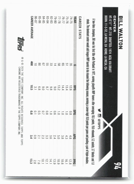 This is a nice example of a 2023-24 Topps Chrome #94 Bill Walton Other important information about this card:17796In 2023 Bill Walton played for the Portland Trail Blazers.Please check out...