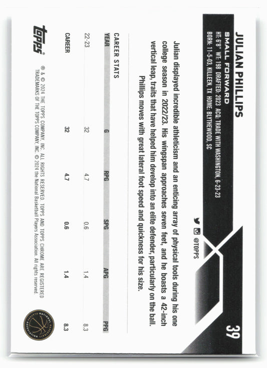 This is a nice example of a 2023-24 Topps Chrome #39 Julian Phillips Other important information about this card:17798RCIn 2023 Julian Phillips played for the Chicago Bulls.Please check out our...