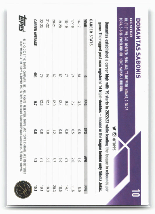 This is a nice example of a 2023-24 Topps Chrome #10 Domantas Sabonis Negative Refractors Other important information about this card:In 2023 Domantas Sabonis played for the Sacramento Kings.Please check...
