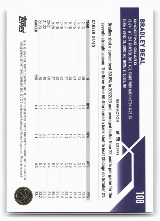 This is a nice example of a 2023-24 Topps Chrome #108 Bradley Beal Refractors Other important information about this card:In 2023 Bradley Beal played for the Phoenix Suns.Please check out...