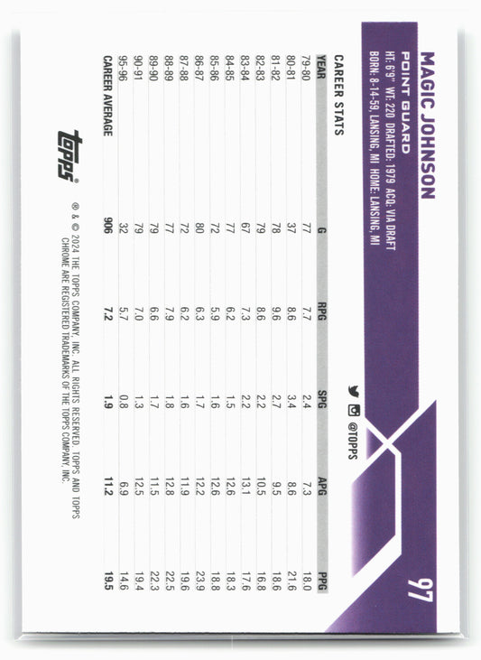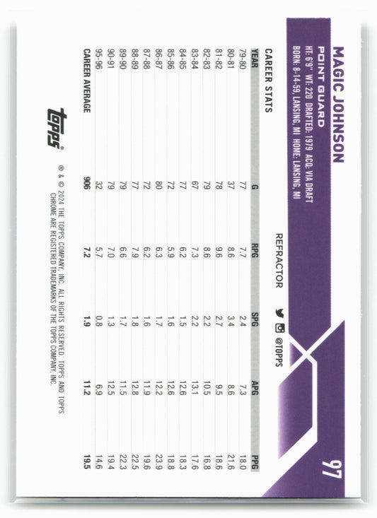 This is a nice example of a 2023-24 Topps Chrome #97 Magic Johnson Prism Refractors Other important information about this card:17806In 2023 Magic Johnson played for the Los Angeles Lakers.Please...