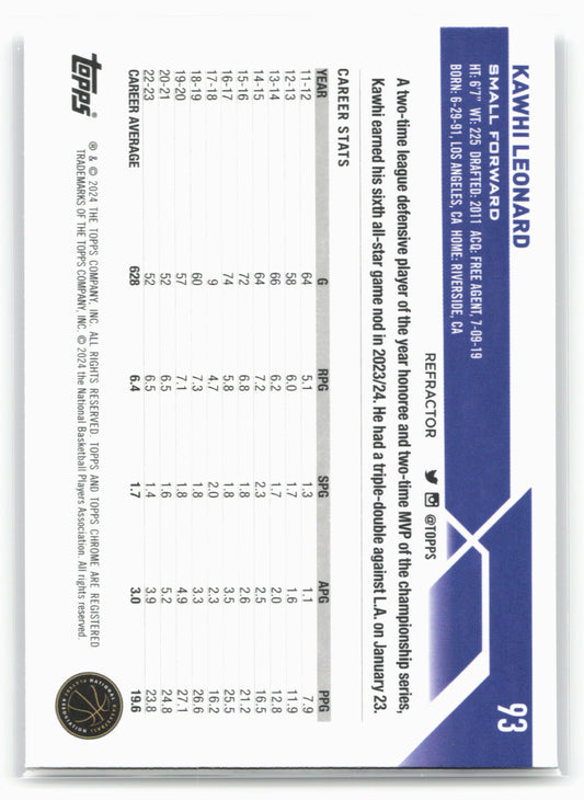 This is a nice example of a 2023-24 Topps Chrome #93 Kawhi Leonard Refractors Other important information about this card:In 2023 Kawhi Leonard played for the Los Angeles Clippers.Please check...