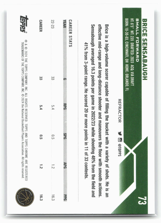 This is a nice example of a 2023-24 Topps Chrome #73 Brice Sensabaugh Refractors Other important information about this card:RCIn 2023 Brice Sensabaugh played for the Utah Jazz.Please check out...